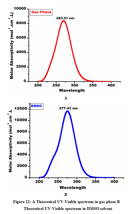 All the calculations were performed utilizing DFT strategy with B3LYP/6-311++G (d,p) basis sets in the Gaussian 03 W program.45 The geometry of the title compound was optimized and the corresponding energy was determined with a 6-311++G (d,p) basis set. Accordingly, the optimized geometrical parameters, energy, atomic charges, dipole moment, and other thermodynamic parameters were calculated theoretically. Also, the theoretical UV-Visible spectrum of the title compound is correlated with the experimental UV-Visible spectrum. Gauss View 4.1 molecular visualization program has been considered to get visual animation. The electronic properties, for example, HOMO–LUMO energies, absorption wavelengths, and oscillator strengths were computed using the B3LYP method of the TD-DFT) and 6-311++G (d,p) basis set.