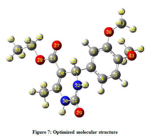 3,4-dihydropyrimidin-2(1H)-ones (DHPMs) have developed as useful building blocks for designing new compounds with an expansive assortment of biological applications.1-3 They have gotten a lot of consideration because of the intriguing pharmacological properties related to this heterocyclic framework. DHPMs have been found to display an expansive scope of biological activities such as antitumor,4 antitubercular,5 antimalarial,6 antiviral,7 analgesic,8 antibacterial,9 anti-inflammatory,10 antifungal,10,11  antidiabetic,12 antiproliferative activities,13 etc. Besides, they have additionally been seen as dynamic calcium channel blockers and antihypertensive specialists.14,15 To the extent that the materials science is concerned, the DHMPs have been adequately used to develop heterocyclic compounds with fine optical properties. In materials science, DHPMs are progressively discovering applications in the advancement of materials. To a great extent examined applications in material science are the advancement in functional polymers, adhesives, and fabric dyes.16-18 Eco-friendly approaches are widely accepted and have been used to reduce environmental hazard.19-28 Many green environment-friendly methodologies were researched for creating newer DHPMs as the biological core. The most common synthetic pathways to DHPMs are microwave irradiation, ultrasound irradiation, ionic liquid strategies, nanoparticles as heterogeneous catalysts, grinding, and solvent-free methods.29 DFT computations are reliable and noteworthy for deciding the structural, electronic, and spectral properties of the molecules.30-44 Theoretical quantum computations derived from the DFT strategy have been productively utilized in different fields. The examination of spectroscopic and quantum chemical parameters is by all accounts essential to investigate the chemical behavior of the molecules. Considering all these discussed talked about imperative parts, in this, we wish to report theoretical and experimental studies on molecular structure, HOMO-LUMO analysis, MESP study, and UV–Visible spectral investigation of ethyl 4-(3,4-dimethoxyphenyl)-6-methyl-2-oxo-1,2,3,4-tetrahydropyrimidine-5-carboxylate. In the current research, DFT examination on molecular structure, bond length, bond angle, Mulliken atomic charges have been discussed. The important parameters such as total energy, HOMO-LUMO energies, charge distribution, thermodynamic properties, etc. also studied using the DFT method. Importantly experimental and theoretical comparison on UV–Visible spectra has been discussed.