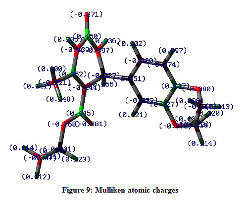 The optimized molecular structure of the title molecule is depicted in Figure 7. Molecular structures A, B, and C (Figure 8) represent presentation along various axes. The optimized molecular geometry provides a good deal of information about the spatial orientation of various atoms in a molecule. From optimized molecular structures, it can be easily seen that the EDMT molecule possesses C1 point group symmetry due to the overall asymmetry of the molecule. Hence, the EDMT molecule is an asymmetric top molecule. This data is a lot of helpful for the determination of various spectroscopic parameters. The geometrical parameters like bond lengths and bond angles for the title molecule have been set up by the DFT/B3LYP strategy with the 6-311++G (d,p) as premise set and are introduced in Table 2. The EDMT molecule comprises of two six-membered rings. The DFT computation predicts the benzene ring is planar (as expected) while the other ring is non-planar. The self-consistent field (SCF) energy of the title molecule at the DFT/B3LYP method with the 6-311++G (d,p) as basis set is found to be −1107.69 a.u. with dipole moment 4.05 Debye. The C10-C12, C13-O27, and C11-O29 bonds are 1.3603, 1.2174, and 1.219 Å long respectively. The bond angles of H21-C20-O28, C2-C1-C6, C1-O38-C39, and H21-C20-O28 are 112.8923 108.6969, 119.8669, 114.9448, and 108.6969° respectively.The bond angle and bond length data are in good agreement with the structure of the title molecule.