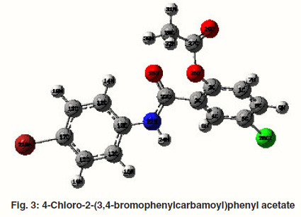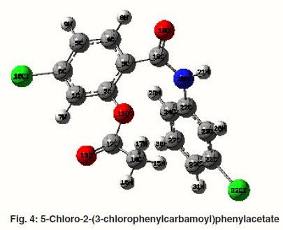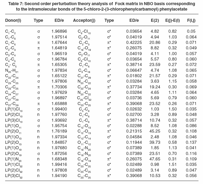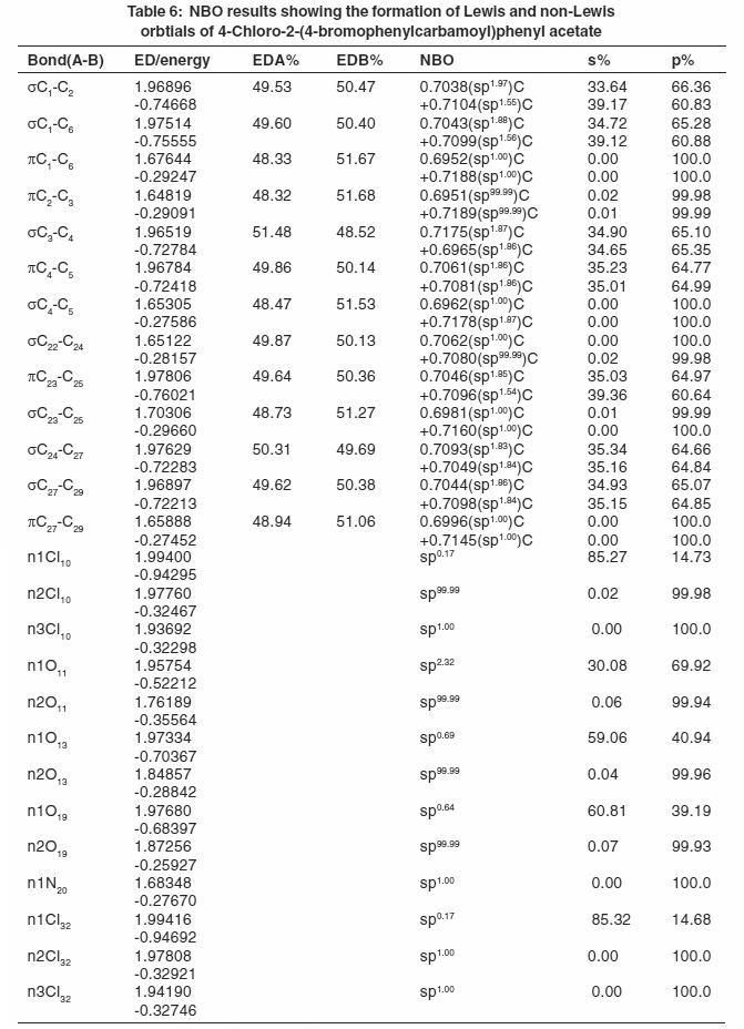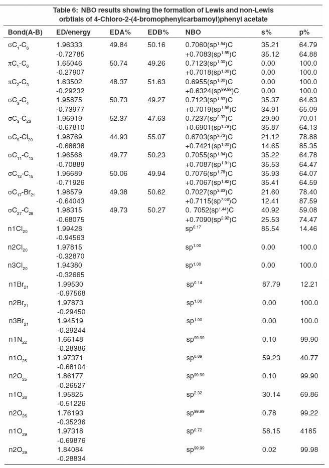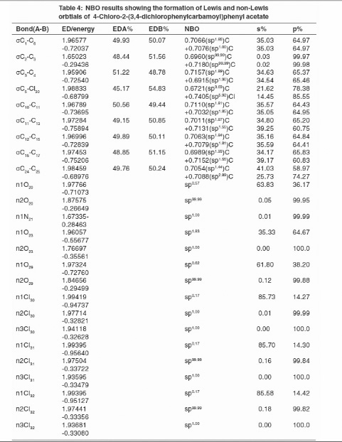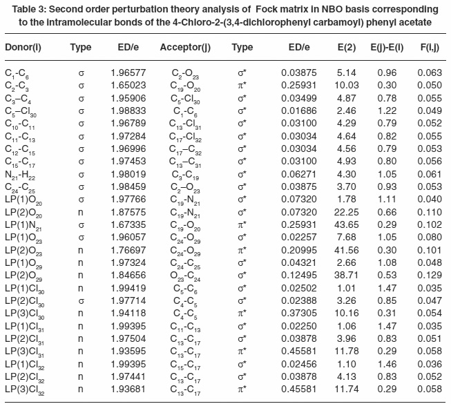 Natural Bond Orbitals (NBOs) are localized few-center orbitals that describe the Lewis-like molecular bonding pattern of electron pairs (or of individual electrons in the open-shell case) in optimally compact form. The natural bonding orbitals analysis has been performed in order to investigate intra-molecular charge transfer interactions, re-hybridization and delocalization of electron density within the molecules. In the NBO analysis1, 2 the electronic wavefunctions are interpreted in terms of a set of occupied Lewis type (bond or lone pair) and a set of unoccupied non- Lewis (anti-bond or Rydberg) localized NBO orbitals. The delocalization of electron density (ED) between these orbitals corresponds to a stabilizing donor acceptor interaction. Second order perturbation theory has been employed to evaluate the stabilization energies of all possible interactions between donor and acceptor orbitals in the NBO basis. The interaction result in a loss of occupancy from the localized NBO of the idealized Lewis structure into an empty non-Lewis orbital. The delocalization effects (or donor acceptor charge transfers) can be estimated from the off diagonal elements of the Fock matrix in the NBO basis. Salicylanilides (2-hydroxy-N-phenylbenzamides) show manifold pharmacological activities.3-8 The presence of amide (-NHCO-) groups in the structure of phenylcarbamoylphenyl-N-alkylcarbamates can cause interaction with various enzymes or enzymatic systems, for example, a carbamate moiety is characteristic for a number of herbicides acting as photosynthetic electron inhibitors.9,10 Imramovsky et al.,11 reported the photosynthesis inhibiting efficiency of a series of salicylanilide alkylcarbamates. Salicylanilides possess a wide range of biological activities and they act as inhibitors of the two component regulatory system in bacteria.12 Salicylanilides have been shown to be active against many pathogens, including Staphylococcus aureus,13 Escherichia coli, Pseudomonas aeruginosa,14 Aspergillus fumigatus,6 as well as being used as anthelminthics in veterinary practice.15 Salicylanilides have shown activity against M.tuberculosis16 although cytotoxicity in mammalian cells is a common problem. Salicylanilides have been suggested to target multiple specific targets in both prokaryotes and eukaryotes, including two component systems,7 transglycosylase,17 type III secretion systems,18 interleukin,19 and protein tyrosine kinase.20 In the present work, the NBO analysis of a series of Salicylanilides derivatives, 4-Chloro-2-(3- chlorophenyl carbamoyl)phenyl acetate, 4-Chloro- 2-(3,4 dichlorophenylcarbamoyl)phenyl acetate, 4- Chloro-2-(4-bromophenylcarbamoyl) phenyl acetate and 5-chloro-2-(3-chlorophenylcarbamoyl) phenylacetate are reported. Vibrational spectroscopic studies of these derivatives are reported by the authors previously.21-24
