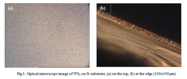 From optical microscope image (Fig.1) we can see a large area of the deposited WS2 film showing homogenous and uniform film without holes or roughness in Fig.(a), and the standing WS2 lamellae as rod-like in Fig.(b). This result was due to many experiments on DC sputtering methods to optimize all parameters and conditions such as value and time of applying voltage, argon ratio, etching condition, distance between target and substrate and so on.