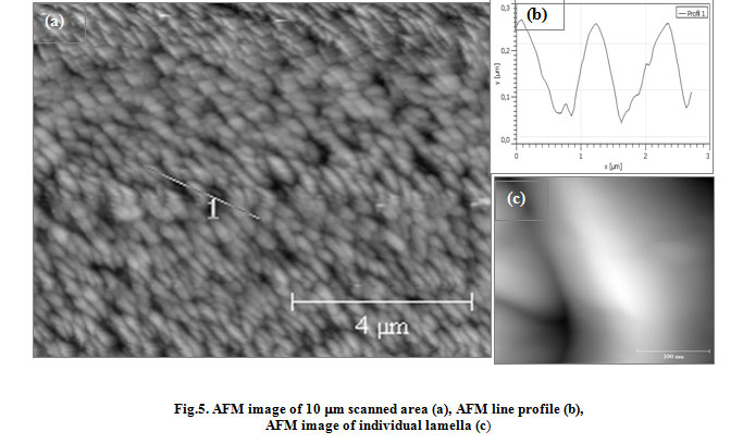 Fig5: AFM image of 10 mm scanned area (a), AFM line profile (b), AFM image of individual lamella (c) |
