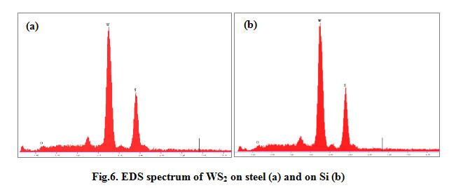 The SEM images in Fig. 3 reveal oriented WS2 crystalline lamellae on Si substrate than on the steel substrate. At first study, we can suggest that the structure of WS2 lamellae took a preferential orientation on Si <110> substrate while they were entangled on the steel substrate.