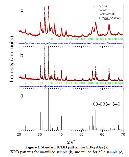 Figure1: Standard ICDD pattern for SrFe12O19 (a), XRD patterns for un-milled sample (b) and milled for 60 h sample (c).
