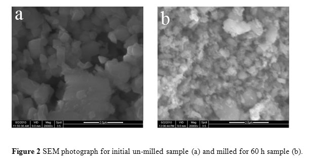 Scherrer formula [8] and the results are shown in Table 1. The average crystallite size for IS is 83 nm, while for MS was 12 nm. So the crystallite size records a 85% reduction as a result of mechanical milling for 60 h. Figure 2 shows a SEM photograph of initial un-milled and milled for 60 h samples. The particle size for IS seems to be around the single domain size of 460 nm