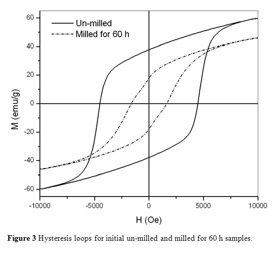 which reported by Rezlescu et al. [9]. While the particle size for MS seems to be smaller than that for IS by an order of magnitude. Figure 3 shows hysteresis loops for initial un-milled and milled for 60 h samples. The coercivity decreased significantly from 4500 Oe for the un-milled sample down to 1600 Oe for the sample milled for 60 h. In view of the fact that the particle size determined from SEM imaging for the un-milled sample is generally of the order or smaller than the critical single domain size of 460 nm [9], we conclude that the particles in this sample are generally single domain particles. Upon milling for 60 h, the particle size dropped significantly by almost an order of magnitude. The coercivity of a single domain particle was reported to follow a typical behavior with particle size, such that the coercivity has a maximum value at the critical single domain size, and decreases with decreasing particle size down to zero at the superparamgnetic critical size [10]. Consequently, the observed reduction in the coercivity is attributed to the reduction of the single domain particle size in the milled sample.