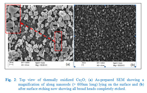 Typical high resolution SEM images of the Cu2O are shown in Fig. 2, for as-prepared (Fig. 2a) and after surface etching by 0.1M HCl for 5 minutes (Fig. 2b). It is observed that, as-prepared Cu2O were characterized by long gradually tapering broad-headed nanorods with long and very sharp ended narrow roots (≈ 25 nm or less) into the bulk (Fig. 2a). A few of these nanorods probably ejected during thermal oxidation are seen lying horizontally on the surface (Fig. 2a). After surface etching using 0.1M HCl (Fig. 2b), all the broad heads were completely chiseled out, thus exposing a densely packed narrow roots of nanorods, whose top view are seen in the high resolution SEM (Fig. 2b). This top view SEM image (Fig. 2b) shows crystallites ranging between 50 – 20 nm in diameter and less, with latter being the majority. Crystal sizes calculation using Debye-Scherrer equation gave mean crystal size between 15.70 – 16.26nm. Results, which lie within acceptable range of typical sharp tip of the nanorods, observed lying in Fig. 2a. This confirms our earlier proposed that the structure consisted of nanorods with sharp tips standing on the substrate. Even in the absence of a confirmatory cross-sectional SEM scan which was not done the ejected surface lying nanorods with broadened surface heads (Fig. 2a) is good enough evidence.