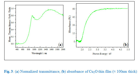 Optical characterizations of the thin films were done using transmittance spectroscopy. Fig. 3a and Fig. 3b below shows typical normalized transmission and absorbance spectra of Cu2O respectively. It is observed from the first figure that the onset of strong transmission starts well after 600nm (Fig. 3a) into the infrared spectra region, else no transmission below this wavelengths. This is consistent with the optimal band energy of Cu2O that has been reported to be 620nm (2.0eV) [Filipič and Cvelbar, 2012]. Alongside transmittance of Cu2O, Fig. 3b shows a typical absorbance spectrum of these samples, where it is observed that weak absorption started slightly below the stoichiometric Cu2O band gap energy (2.0eV). The onset of strong absorption, as shown in Fig. 3b, was at 1.6eV, which is clearly beyond CuO band edge (1.2eV). This observation is a strong indication that, the films were dominantly composed of Cu2O or CuO phase if were present, must have been extremely thin to be have significant foot print in the optical transmittance data used. The absorption witnessed below the Cu2O absorption edge can be therefore attributed to trace CuO in addition to possible interband transitions in Cu2O as a result of surface states or states associated with remnants impurities, possibly related to partial thermal oxidation of elemental copper, etc.