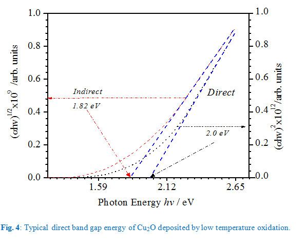 Fig. 4, is a typical plot of Plot of (αhv)n versus photon energy for a 100nm thick Cu2O film, where ‘n’ is constant assigned a values of 2 or for allowed direct transition and indirect transitions respectively. From the intercepts of the linear fits, the optical band energy gaps were estimated to be 1.82eV and 1.96eV for indirect and direction band to band transitions respectively. These results are in agreement with earlier observations reported for monocrystalline Cu2O phases synthesized by thermal oxidation at temperatures below 1000oC, albeit film thickness dependency of the energy gaps observed by Rasadujjaman and his coworkers [Rasadujjaman et al., 2012]. Rasadujjaman’s group reported a systemic reduction of Cu2O band gap with increasing film thickness.