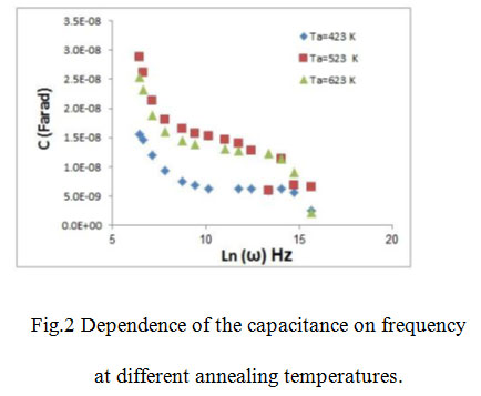 Fig.(2) show the variation of capacitance with frequency at various annealing temperatures in the range (423-623) K. the capacitance initially decreases rapidly with increasing frequency.