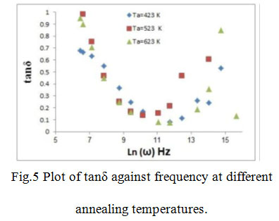 Fig.(5) shows the frequency dependence of loss tangent(tan δ) at different temperatures for a typical film Ge10Se20 Bi80  of thickness 230 nm. Tan δ has been found to increase with frequency at different temperatures, pass through a maximum value (tan δ) max and thereafter decreases. As the temperature is increased, the frequency at which (tan δ)max occurred shifted to higher frequencies. This type of behavior is similar to that described by Simmons (Safa’s M. Hraibat et al, 2013) for films having parallel RC elements of the materials in series with a parallel combination of Schottky barriers capacitance and resistance.