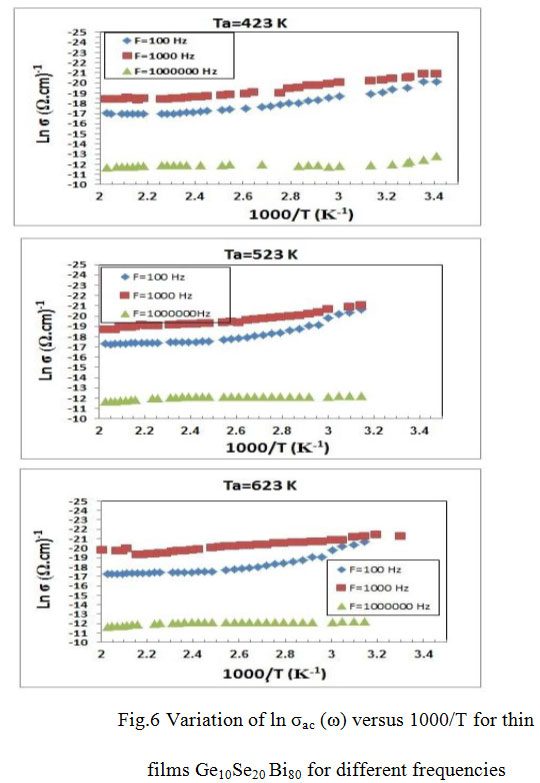 Variation of ln σac (ω) versus 1000/T for thin films Ge10Se20 Bi80 for different frequencies  It is clear that at low temperatures and frequencies the conductivity is frequency dependent; however, with increasing temperature the conductivity becomes frequency independent, remaining almost constant throughout the entire frequency range. The strong temperature dependence may be due to the increase of the density of neutral defects Do (single-polaron states) at a higher temperature. The contribution toσ ac (ω,T) from(CBH) of single polarons exceeds that of bipolarons at a high temperature (Sevi Murugavel and Manisha Upadhyay, 2011), i.e. the CBH of single polarons is then the predominant contribution to the AC conduction at higher temperature. The deduced values of activation energy reported in table (2) for various values of annealing temperature. The activation energy decreases with increasing frequency. The low value of the ac activation energy and the increase of σ ac(ω), with the increase of frequency confirm that hopping conduction is the dominant current transport mechanisms. Thus, the increase of the applied frequency enhances the electronic jumps between the localized states; consequently, the activation energy ΔE, decreases with increasing frequency (M.S. Hossaina et al, 2008).