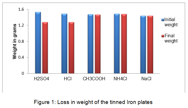 The results obtained from the study suggest that the maximum weight loss was in the sulphuric acid followed by hydrochloric acid and acetic acid. In ammonium chloride the loss in weight was very little and almost none in sodium chloride. (Table 1, Fig 1). On the basis of weight loss the corrosion rate was calculated which was then used to predict the severity of corrosion on the metal [2]. The rate of corrosion was in the following order sulphuric acid > hydrochloric acid > acetic acid > ammonium chloride > sodium chloride. (Table 1, Fig 2). The rates of corrosion infer the severity of corrosion on the material. In sulphuric and hydrochloric acid the corrosion rate was found to be severe, in acetic acid and ammonium chloride it was moderate where as in sodium chloride it was found to be safe (Table 1). The pictures of affected plates of tinned iron in the above media also greatly depict the corrosion by showing decolourization and tarnishing effect (Fig 3). Maximum decolourization was found in sulphuric and hydrochloric acid. It has almost turned black. In acetic acid and ammonium chloride effect of tarnishing is less than the strong acids. Sodium chloride showed very little tarnishing.