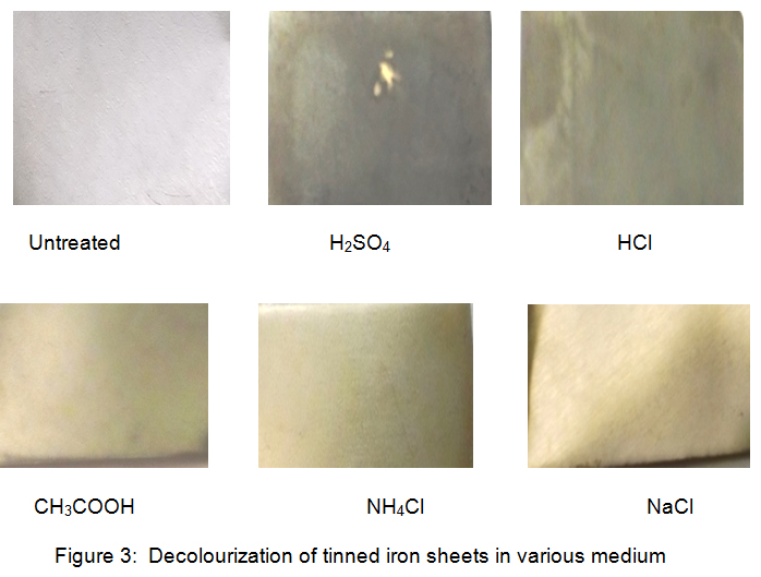Figure 3: Decolourization of tinned iron sheets in various medium