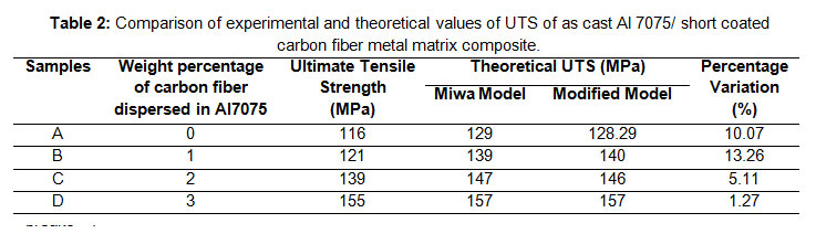 Table 2: Comparison of experimental and theoretical values of UTS of as cast Al 7075/ short coated carbon fiber metal matrix composite.