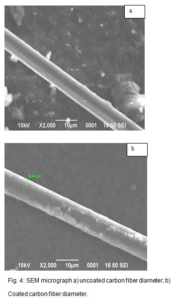Fig. 4: SEM micrograph a) uncoated carbon fiber diameter; b) Coated carbon fiber diameter.