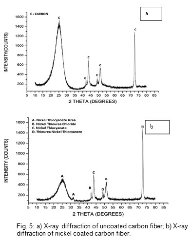 Fig. 5: a) X-ray diffraction of uncoated carbon fiber; b) X-ray  diffraction of nickel coated carbon fiber.