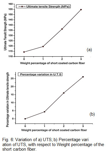 Fig. 6: Variation of a) UTS; b) Percentage vari ation of UTS, with respect to Weight percentage of the  short carbon fiber.