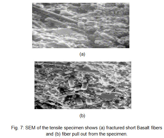 Fig. 7: SEM of the tensile specimen shows (a) fractured short Basalt fibers and (b) fiber puIl out from the specimen.