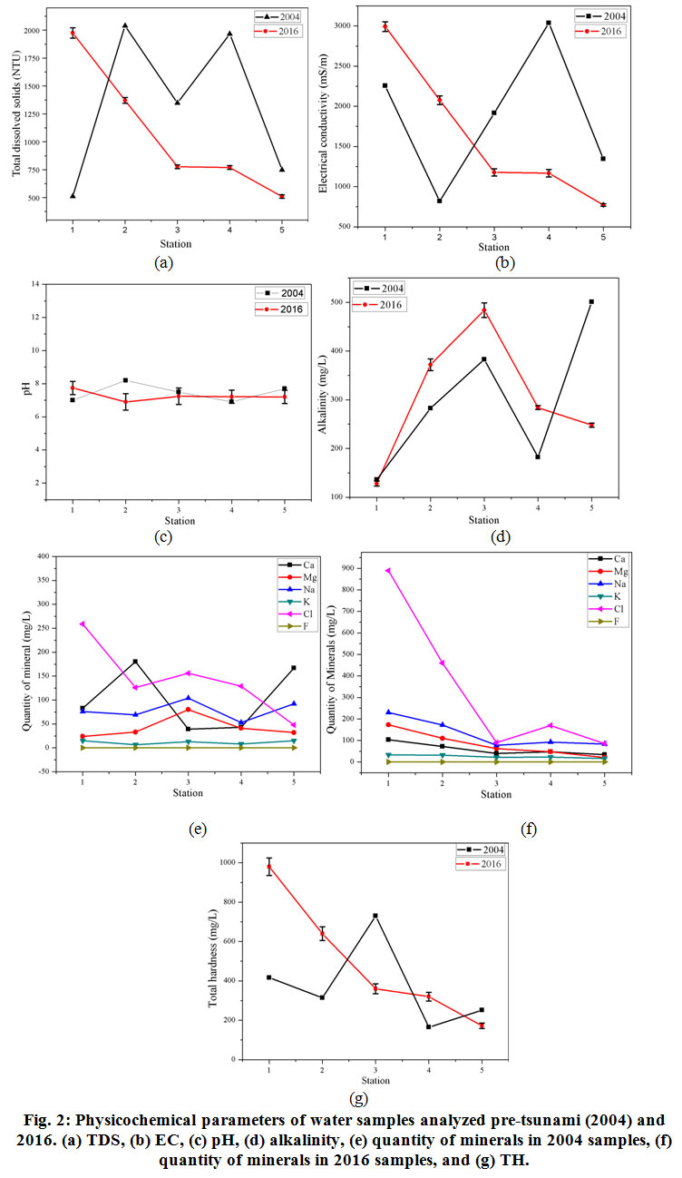 On one hand, Figure 2c indicated that pH of the water samples pre-tsunami and 2016 does not significantly change. The pH of all the samples of 2016 was weakly alkaline ranging from 6.9 to 7.74. On the other hand, there is not much significant change in the values of alkalinity (Table 2 and Figure 2d) for samples collected in 2004 and 2016. The results of pH and alkalinity are coherent in nature.