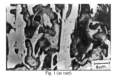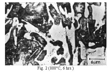 Composition of the alloy is given in Table 1. Heat treatments comprised of air cooling from 850,900, 950, and 1000°C after holding for periods ranging from 2 to 10 hours. Hardness testing was carried out on a Vickers hardness tester employing a 30 Kg load. Optical metallography was employed to study the effect of the heat treatment on microstructure. Specimens were etched with 2% natal. Quantitative metallography was carried out with the help of a LEITZ image analyzer and electron probe micro analyzer (EPMA). Corrosion testing was carried out as per the relevant ASTM specifications (G-1-72). Specimens, paper polished up to 4/0 to attain mirror finish, were cleaned firstly with double distilled water and finally with acetone, dried, weighed and suspended for 168 hours in a beaker containing 6% NaCl solution under stagnant conditions at room temperature. After removal from the solution, specimens were again cleaned, dried and weighed. From the weight loss, the corrosion rates in milligram per square decimeter per day (mdd) were calculated by using the formula 1: