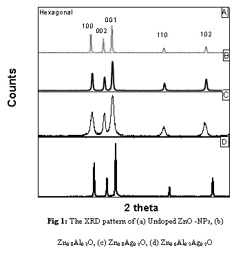 The structural properties were analyzing the effect of addition of Ag and Al codoped ZnO nanoparticles by using to study the XRD. Fig 1 is representing the XRD series for codoped ZnO nanoparticles. The single phase is confirmed by preferred orientations (100), (002), (101) i.e. three higher most peaks (all the peaks) of hexagonal wurtzite crystalline structure of ZnO matching with ICDD card. There is no additional peaks are observed corresponding to Ag and Al nanoparticles and it indicates the purity of the samples. The Debye-Scherer’s formula are used to calculate the average nanocrystalline size ( D = Kλ/βDcosθ) where D (nm) is the crystalline size, k is a constant (equal to 0.94) λ and  is the wavelength (equal to 1.542 Å),  βD is full width at the half maximum intensity, and  is position of peak.