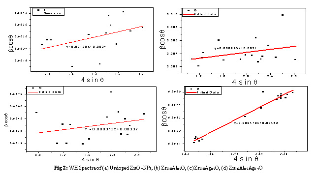 Fig 2: WH Spectra of (a) Undoped ZnO -NPs, (b) Zn0.8Al0.2O, (c) Zn0.8Ag0.2O, (d) Zn0.6Al0.2Ag0.2O