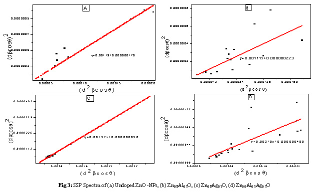 In this case of size-strain parameter can be found that both the crystalline size and the microstrain get together. From equation (3), the graph plotted between (dhklβhkl cosθl)2 VS (d2hklβhkl) The crystalline size was calculated by using slope of the linearly fitted data and strain get by y- intercept, as from equation (3). For undoped, doped and codoped NPs, the results were evaluated for SSP method as shown in Table 1.