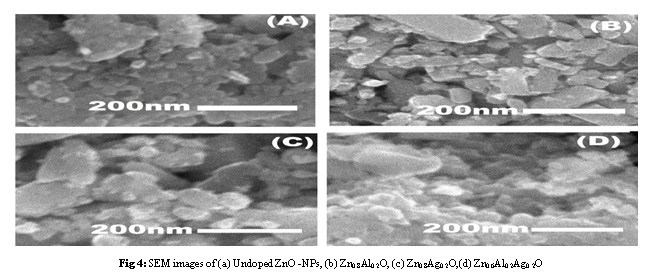 The scanning electron microscope (SEM) analysis is used to find out the morphology of undoped, doped and co-doped samples studies. The particles are spherical in shape with large agglomeration. The aggregation is approximately controlled and smaller in size in case of undoped ZnO but large aggregation trends follow Ag-doped ZnO, Al-doped ZnO, co-doped (Ag, Al) samples which are shown in a reliable and identical shape. It clearly indicated that the crystalline size is relatively same as that of the SEM measurement. The particle size goes on increasing because of dopant Ag as shown in Fig 4(B) and Fig 4(C), Al-doped NPS are of smaller particles size i.e. it both the cases both dopants disperse equally in the different sites. SEM micrograph shows that for undoped ZnO nanoparticles size is smaller than the co-doped ZAAlO nanoparticles, which is also confirmed by the XRD results. Wu et. al. has also reported on SEM images for undoped Al-doped ZnO that effects by Ag nanoparticles as Ag/Zn = 0.05 (b), 0.10 (c) and 0.15 (d) at.%, which indicate the almost similar effect of doping particles as shown in studies.19