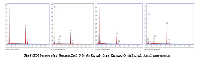 Fig 5: EDS Spectra of (a) Undoped ZnO -NPs, (b) Zn0.8Al0.2O, (c) Zn0.8Ag0.2O, (d) Zn0.6Al0.2Ag0.2O nanoparticles