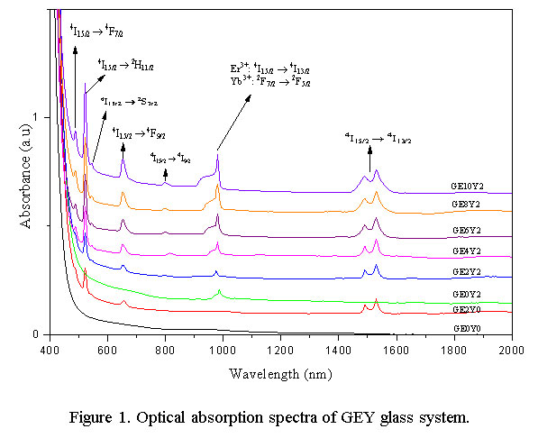 Table 1: Values of cut off wavelength, Eopt and ΔE of GEY glasses codoped with Er3+/Yb3+.