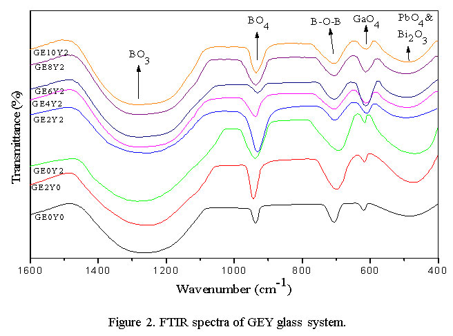 The FTIR spectra of GEY glass system codoped with Er3+/Yb3+ was shown in figure 2. The band cited at ~482 cm-1 is attributed to the bending vibrations of Bi2O3 pyramidal units and also because of the presence of PbO4 units.25 The band indicated at ~613 cm-1 is because of network forming GaO4 tetrahedral groups.26 A band was identified at ~707 cm-1, which is produced by the vibrations of B-O-B linkages. Asymmetric stretching vibrations of B-O bands in BO4 units produces a band at ~930 cm-1. The band identified at ~1250 cm-1 is because of asymmetric stretching vibrations of BO3 units.27