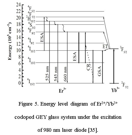 codoped glasses upon the incitement of 980 nm laser source.30 The energy transfer mechanism between Er2O3 and Yb2O3 mainly involves ground state absorption (GSA), energy transfer (ET) and excited state absorption (ESA). The energy transfer mechanism which is responsible for the green and red emissions was explained in detail in our previous papers.31,32