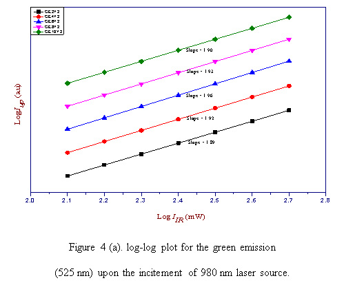 Figure 4 (a): log-log plot for the green emission (525 nm) upon the incitement of 980 nm laser source