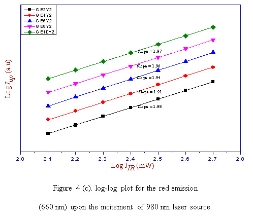 From the spectra it can be concluded that the intensity of green and red emissions increases with increase in the concentration of Er3+ ions upto 0.6 mol% (GE6Y2) and decreases with further increase in the concentarion of Er3+ ions in Er3+/Yb3+ codoped glass samples. In an upconversion, the emission intensity (Iup) increases in proportion to the nth power of infrared excitation intensity (IIR), i.e.,