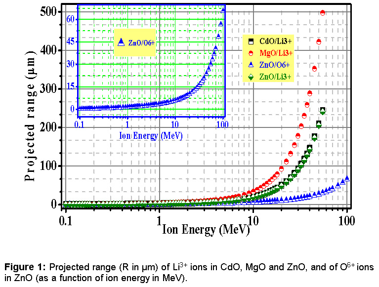 Figure 1: Projected range (R in µm) of Li3+ ions in CdO, MgO and ZnO, and of O6+ ions in ZnO (as a function of ion energy in MeV).