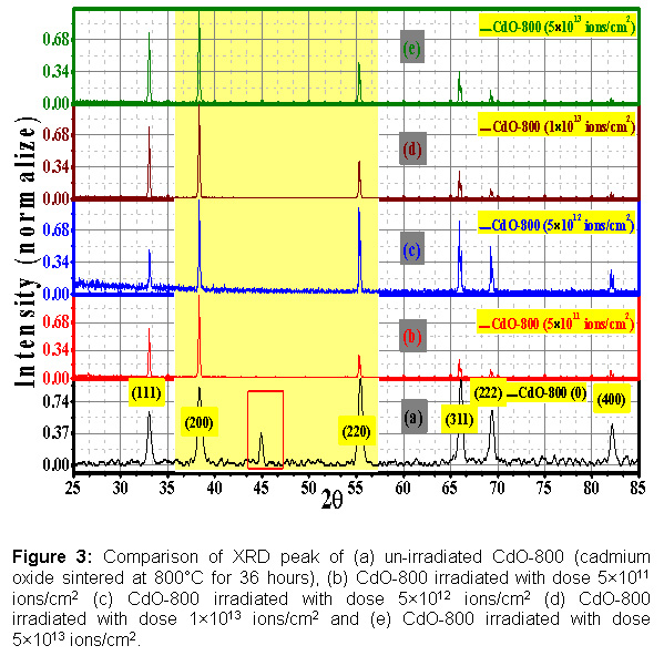 Figure 3: Comparison of XRD peak of (a) un-irradiated CdO-800 (cadmium oxide sintered at 800°C for 36 hours), (b) CdO-800 irradiated with dose 5×1011 ions/cm2 (c) CdO-800 irradiated with dose 5×1012 ions/cm2 (d) CdO-800 irradiated with dose 1×1013 ions/cm2 and (e) CdO-800 irradiated with dose 5×1013 ions/cm2.