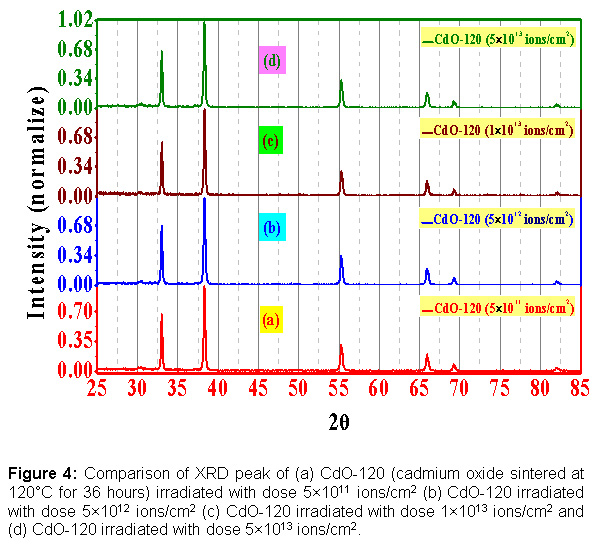 Figure 4: Comparison of XRD peak of (a) CdO-120 (cadmium oxide sintered at 120°C for 36 hours) irradiated with dose 5×1011 ions/cm2 (b) CdO-120 irradiated with dose 5×1012 ions/cm2 (c) CdO-120 irradiated with dose 1×1013 ions/cm2 and (d) CdO-120 irradiated with dose 5×1013 ions/cm2.