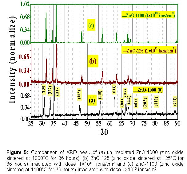 Figure 5: Comparison of XRD peak of (a) un-irradiated ZnO-1000 (zinc oxide sintered at 1000°C for 36 hours), (b) ZnO-125 (zinc oxide sintered at 125°C for 36 hours) irradiated with dose 1×1013 ions/cm2 and (c) ZnO-1100 (zinc oxide sintered at 1100°C for 36 hours) irradiated with dose 1×1013 ions/cm2.