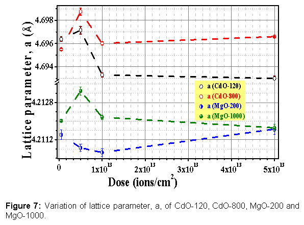 In Fig. 7, present Li irradiation is seen affect lattice parameter, a, for CdO and MgO in an interesting manner. Lattice spacing a(CdO-120) reaches a small peak (Table 4) for irradiation fluence of 5×1012 Li-ions/cm2, while a(CdO-800) reaches a much larger peak at this fluence. MgO-1000 also shows a large peak in Fig 7 at this fluence, while MgO-200 has an opposite behavior to touch a small minimum at 1×1013 Li-ions/cm2. Detailed study of a possible difference in the initial or un-irradiated state should explain the opposite behavior of MgO-200. Since radiation damage and radiation annealing2 change lattice parameter oppositely, a maximum or minimum in spacing on varying the fluence is definitely possible. More work involving additional characterizations can establish such an explanation.