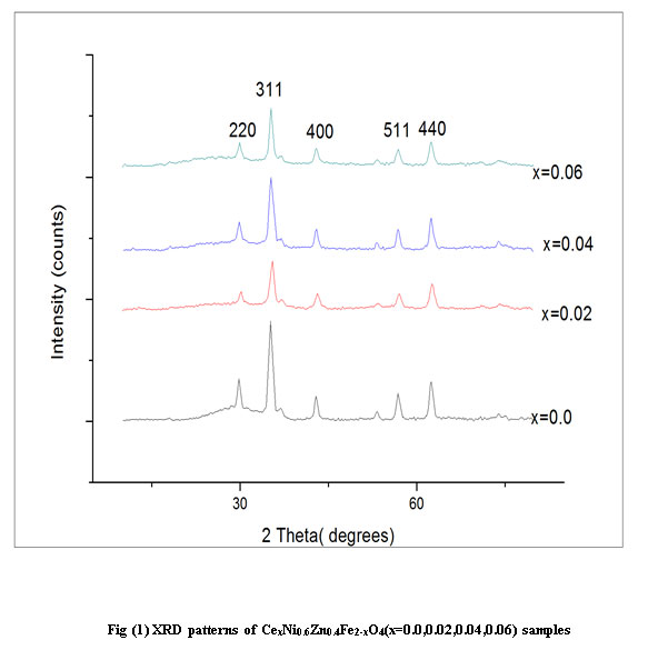 XRD patterns of Ce doped Ni-Zn mixed ferrite for x=0, 0.02, 0.04, 0.06 nanoparticles are presented in fig (1). The diffraction peaks in the patterns correspond to reflection planes of a cubic spinel crystal of Ni-Zn ferrite. Broad diffraction peaks represent the nano sized crystallites.