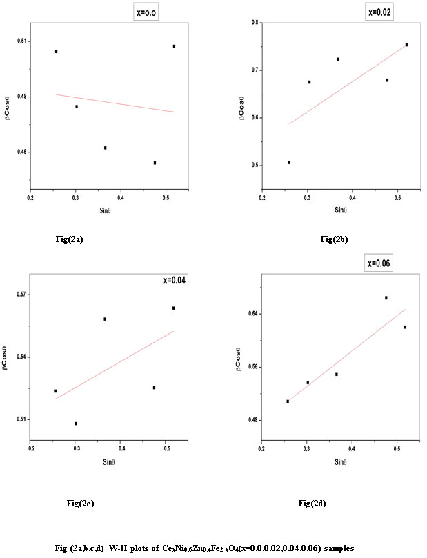 Figure 2a,b,c,d: W-H plots of CexNi0.6Zn0.4Fe2-xO4(x=0.0,0.02,0.04,0.06) samples