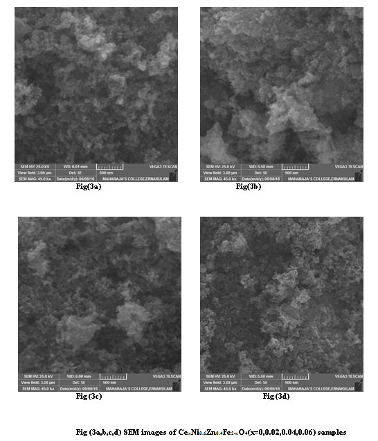 The crystallographic information like average crystallite size D, lattice constant a, X-ray density Dx and porosity P are found using indexed XRD patterns of the samples. XRD patterns were recorded using X-ray powder diffractometer at room temperature using Cu-Kα radiation (λ= 1.5406 Ao) at 40kV and 35mA. The crystallite size is calculated using the Scherrer formula. For recording the FTIR spectra in the range from 400cm-1 to 3500 cm-1 at room temperature the pellets of the samples were prepared using KBr as solvent. The morphology and grain size are analysed using SEM (VEGA3TE SCAN).