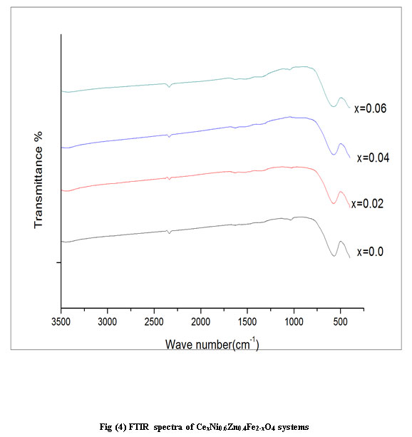 Two distinct broad peaks are seen in all the spectra. While the high frequency dip around 575cm-1 (ν 1 ) is the stretching vibration of metal oxygen bond at the tetrahedral or A site , the lower frequency dip around 400cm-1 (ν 2) corresponds to the metal oxygen bond vibration at octahedral or B site. The value of ν 1 slightly increases and ν 2 shows a shift to lower frequency with increase in Ce3+ doping. The shift of ν 1 towards higher frequency side is attributed to the perturbation in the Fe3+-O2- bonds caused by the substitution of Ce3+ ions and the lattice distortion (T.J Shinde et al, 2012). Increase in site radius at B-site due to occupancy of Ce3+ ions of larger ionic radius replacing Fe 3+ ions has reduced the fundamental frequency ν 2 (K B Modi et al, 2006).