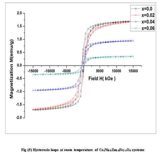 Figure 5: Hysteresis loops at room temperature of CexNi0.6Zn0.4Fe2-xO4 systems