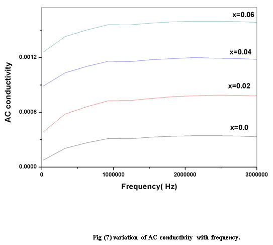 AC conductivity initially increases linearly with frequency. The increase is related to conduction by electron exchange between the Fe ions of different valence states. The electron exchange between A-B sites is more significant than B-B exchange. On applying the AC field, the electron exchange increases thereby resulting in an increase in the AC conductivity (K.M.Batoo , 2011).