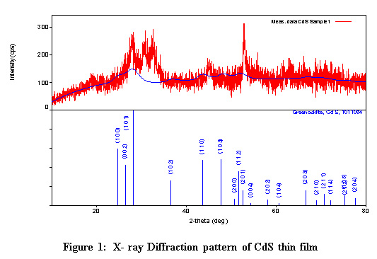 Figure 1 show the X- Ray diffraction pattern of CdS thin film obtained using X-Ray generated at 40kv energy and 15mA current without filter. SC 70 detector with the continuous scan mode was used. Qualitative Analysis Result shows that the Phase Name of the film is Greenokite with the formula CdS having DB Card number 1011054. The peak list of the CdS sample is shown in table 1.13,14