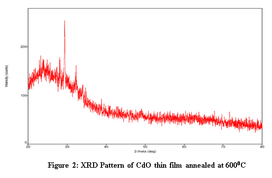 The  thermally oxidized  CdO thin film were obtained by annealing the CdS  as-depodited at 6000C for more than 8 hours. The X- Ray diffraction data obtained for CdO thin film given in the table 2 and X- ray reflection peaks shown in figure 2  It is seen from the table 2 that the annealing temperature changes  the grain size.  The prominent reflection peaks are observed at the annealing temperatur 6000C as seen in figure 2. The 2theta values corresponds to the particular reflection planes indicating the formation of CdO nanoparticle having pure hexagonal structure which matches with the standared JCPDF data.15,16