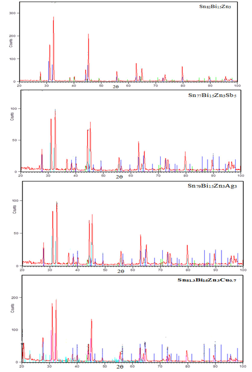 Figure 1 shows x-ray diffraction patterns of Sn82Bi15Zn3, Sn77Bi15Zn3Sb5, Sn79Bi15Zn3Ag3 and Sn81.3Bi15Zn3Cu0.7 alloys which have sharp lines corresponding to tetragonal β-Sn phase, hexagonal Bi phase, Zn phase and small lines represented undetected intermetallic compounds with dissolved atoms (Cu or Sb or Ag) in matrix formed a solid solution. The details of x-ray analysis of usedalloys which comes from the x-ray device (2θ, Int. %, d Å, FHWM and area) and x-ray cards (phase and Miller indices) are listed in Table 1. The x-ray analysis show that, the feature of formed phases such as crystallinity (peak intensity), crystal size (peak broadness) and orientations (peak position, 2θ) for Sn82Bi15Zn3 alloy changed after adding antimony, silver and copper. That is because these elements atoms dissolved in matrix alloy formed a solid solution with undetected phases that agree with pervious work6,7 and other.8- 10
