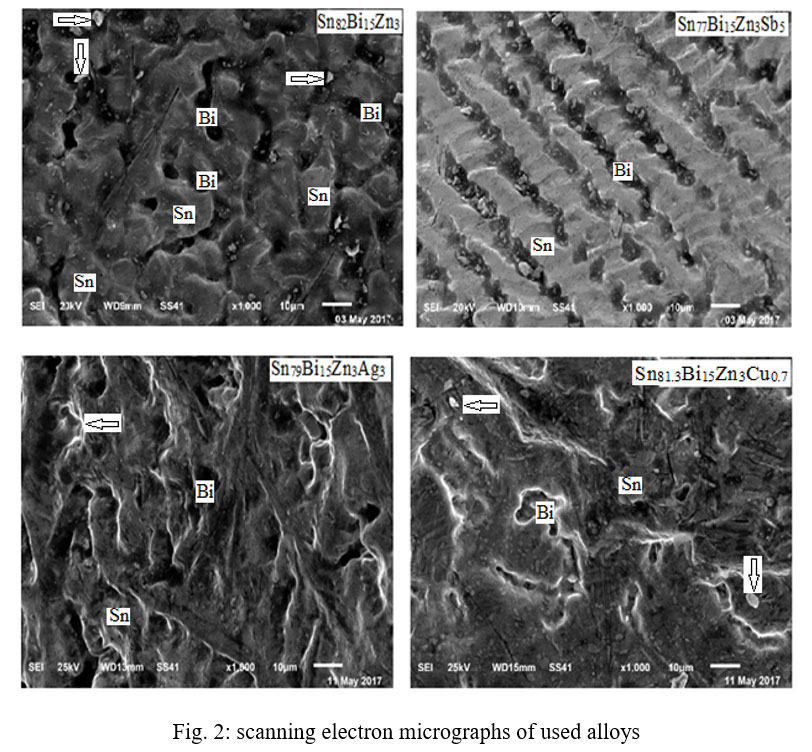 Fig. 2 shows the scanning electron micrographs of Sn82Bi15Zn3, Sn77Bi15Zn3Sb5, Sn79Bi15Zn3Ag3 and Sn81.3Bi15Zn3Cu0.7 alloys. Sn82Bi15Zn3 alloy has lamellar structure (tin phase as gray color and bismuth phase as black color) contained white color (zinc or bismuth- tin) with different shape and size. Sn77Bi15Zn3Sb5 alloy has a good symmetric lamellar structure (gray broad lamellar structure and black small width lamellar) contained white small crystals with different shape. Sn79Bi15Zn3Ag3 alloy has a mixed lamellar structure and white color along at the lamellar boundary. Sn81.3Bi15Zn3Cu0.7 alloy has a heterogeneous structure and white color as slabs with different shape, size and orientation.[Jagadeees1] From SEM graphs analysis, it obvious that, these alloys have heterogeneous structure which confirmed from x-ray and DSC results.